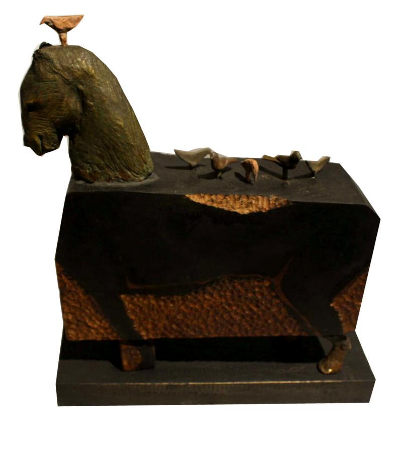...The sculpture depicts a stylized horse formed from a mixture of materials, featuring a textured, dark body with a prominent, abstracted head. The horse's surface is smooth and angular, contrasting with the rougher texture of the base. On the horse's back, several small birds are positioned, adding a whimsical touch to the composition. The overall color palette is muted, with earthy tones dominating, while the horse’s head features a subtle green hue. The piece stands firmly on a rectangular base, enhancing its stability and presence in any space.