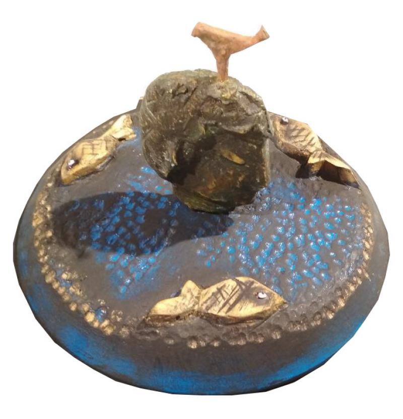 The sculpture features a circular base painted in deep shades of blue and gray, resembling water. At the center, a textured rock rises, topped with a small protrusion that mimics a sprouting plant. Surrounding the rock, several fish shapes, crafted from a contrasting golden material, swim in a circular pattern. Each fish is adorned with small, sparkling embellishments, suggesting scales. The surface of the base is uneven, adding depth and a tactile quality. Subtle shadows enhance the three-dimensionality, while the rich colors evoke a sense of tranquility. This sculpture evokes the spirit of works by artists like Henry Moore and Barbara Hepworth, known for their organic forms and connection to nature. The use of mixed media and textural interplay resembles Moore's abstract forms, while the aquatic theme aligns with Hepworth's focus on nature. Both artists often incorporate elements that encourage viewers to engage with the natural world, similar to the contemplative nature of this piece.